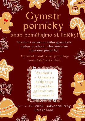 Studenti strakonického gymnázia budou prodávat vlastnoručně upečené perníčky. 5. - 7. 12. 2025 - adventní trhy Strakonice.
