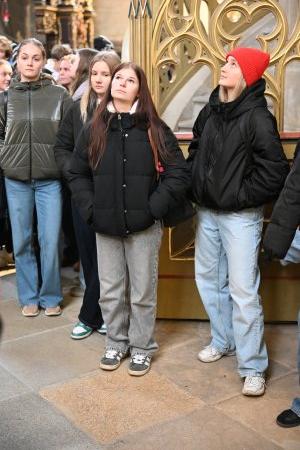 Tam naše kroky směřovaly do katedrály sv. Bartoloměje. Čekala nás komentovaná prohlídka, kde jsme si mohli prohlédnout jednotlivé oltáře a mistrovské gotické dílo Plzeňské madony. Jediným mínusem byla zima a vlhko uvnitř. Po prohlídce jsme měli krátkou přestávku na oběd, kterou jsme využili k občerstvení v nejbližších fast foodech, poté naše kroky směřovaly k poslední zastávce, a to k návštěvě Západočeské galerie. Zde jsme měli možnost prohlédnout si výstavu Josefa Šímy a jeho vrstevníků (J. Štýrského, M. Ernsta, G. de Chirica, Toyen) s názvem Mezisvěty, odkazující na prolínání a střetávání různých světů v jeho tvorbě. Mezi vystavenými díly nebyly jen cenné obrazy a návrhy vitráží, ale i ilustrace básnických sbírek, které Josef Šíma vytvořil po setkání s ruským lingvistou Romanem Jakobsonem. V nich řešil vztah poezie i významu slova k dané věci. Šíma pobýval i několik let ve Francii, což jeho tvorbu velmi ovlivnilo, ale často se vracel zpět do Prahy. Také spolupracoval na mnoha dílech se Seifertem, jelikož patřili společně do stejného hnutí Devětsil.