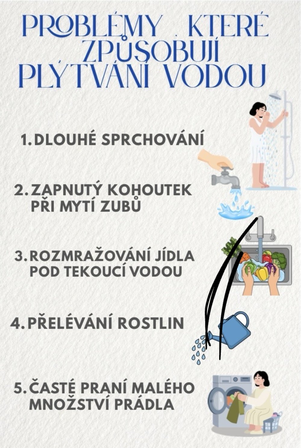 Voda je základ života, ale co o ní skutečně víme? Letošní oslavy Světového dne vody jsme pojali formou týmové soutěže pro žáky nižšího gymnázia. Soutěž začala 2. března a prověřila nejen znalosti soutěžících, ale i jejich kreativitu a schopnost nadchnout ostatní. Týmy musely během soutěže zdolat celkem pět výzev od tvoření vizuálních návodů, jak efektivně šetřit vodou v každodenním životě, přes video s vodou až k pátrání po tom, kolik vody skutečně spotřebujeme – nejen při sprchování, ale i kolik „neviditelné“ vody stojí výroba potravin od jejich růstu až po moment, kdy nám přistanou na stole.