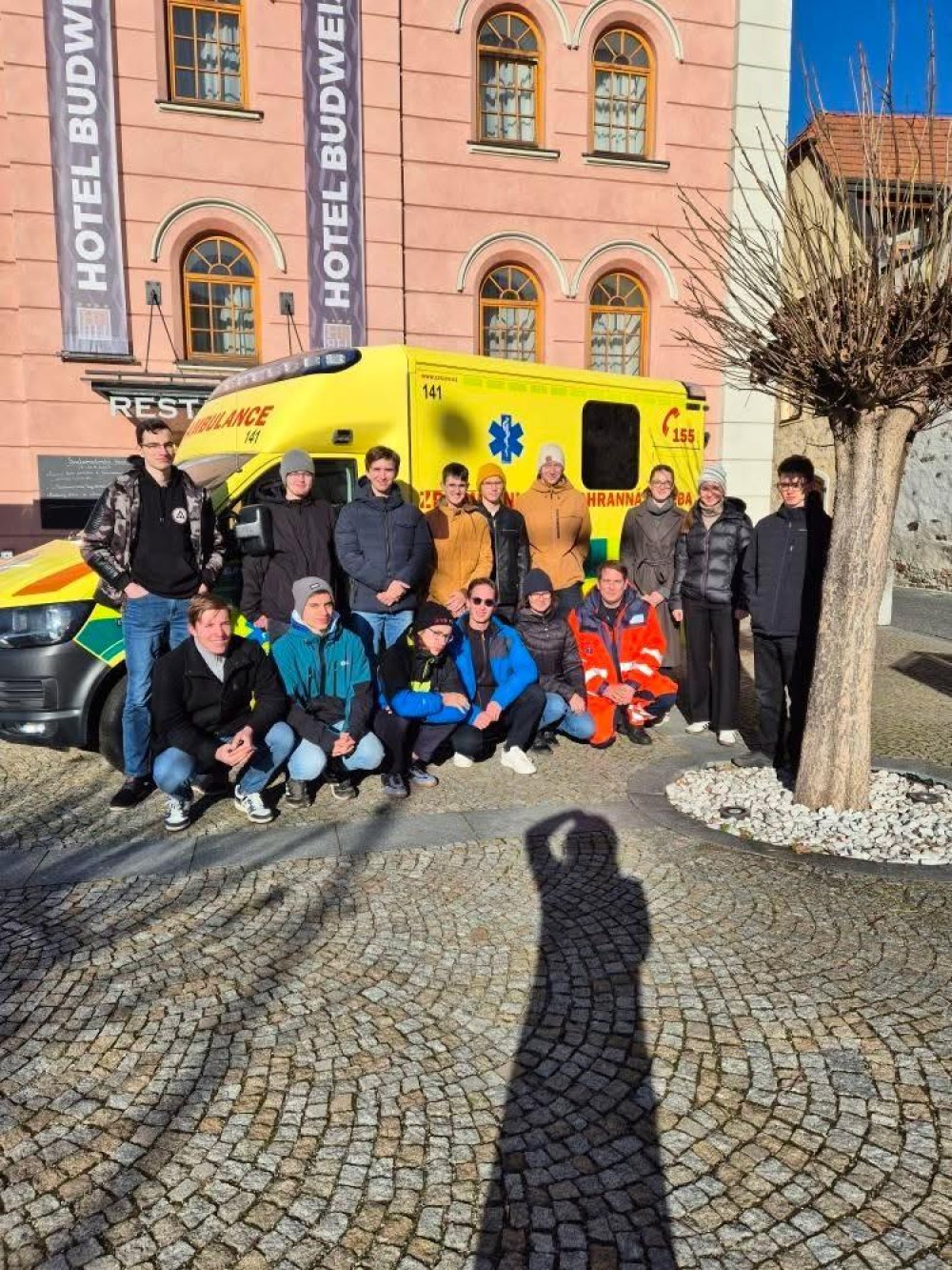 V neděli nás čekal kurz se záchrannou službou, během kterého jsme si vyzkoušeli první pomoc a podívali se do sanitky, kde nám záchranář podrobně ukázal její vybavení.